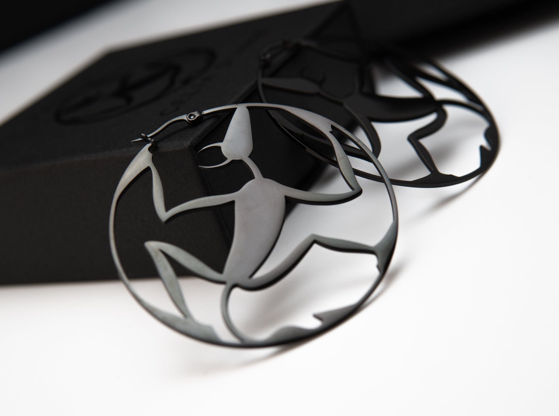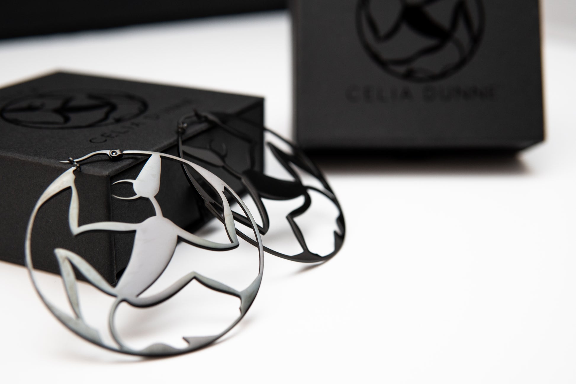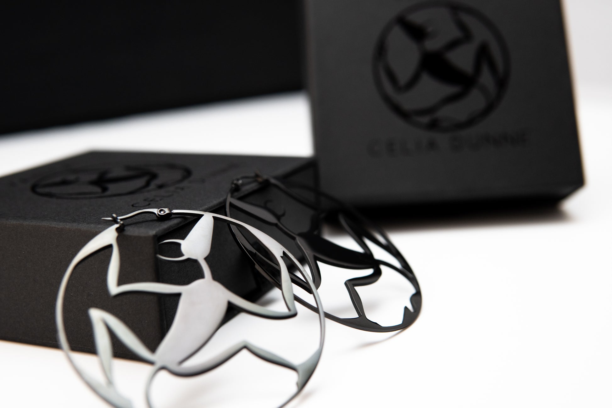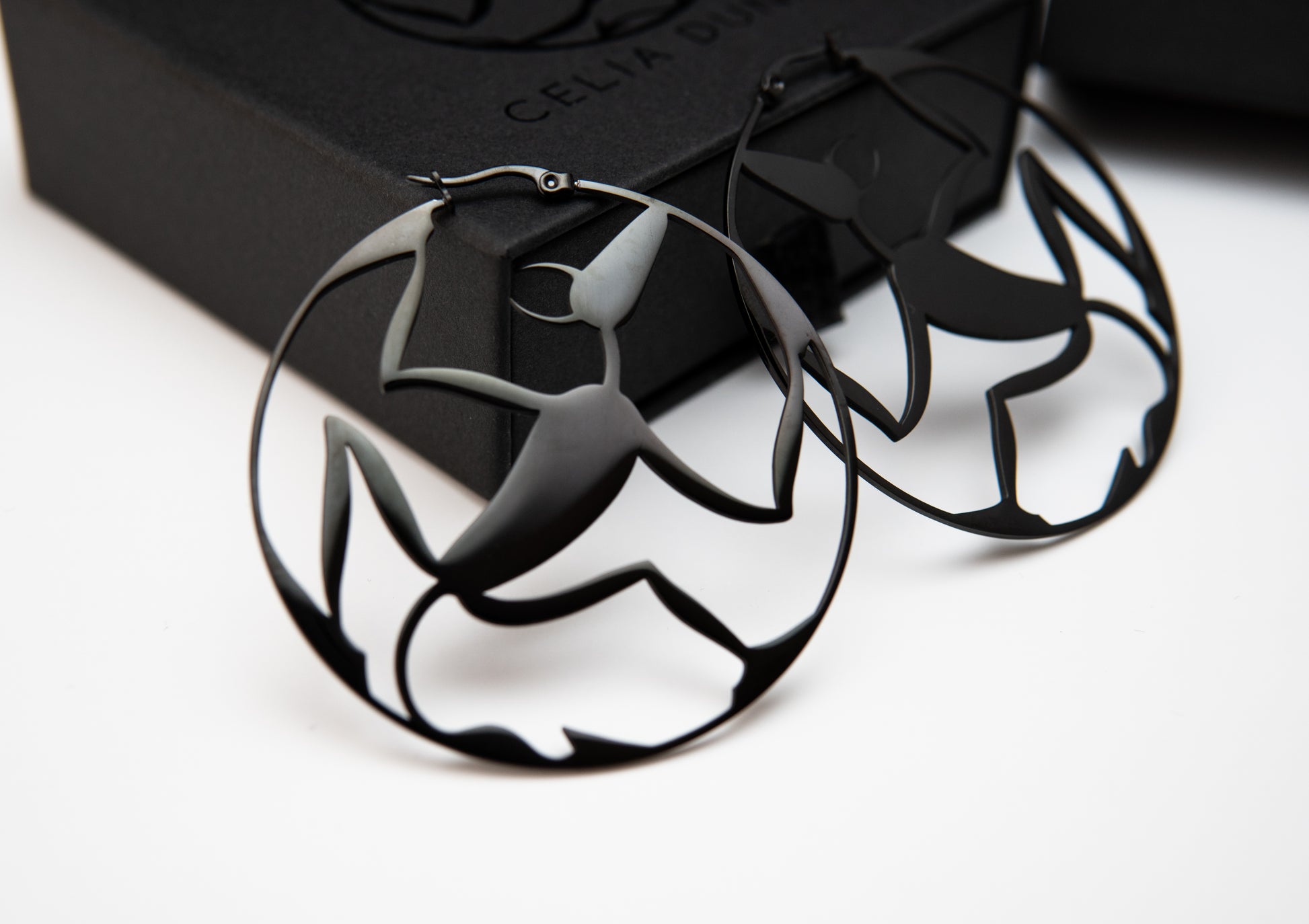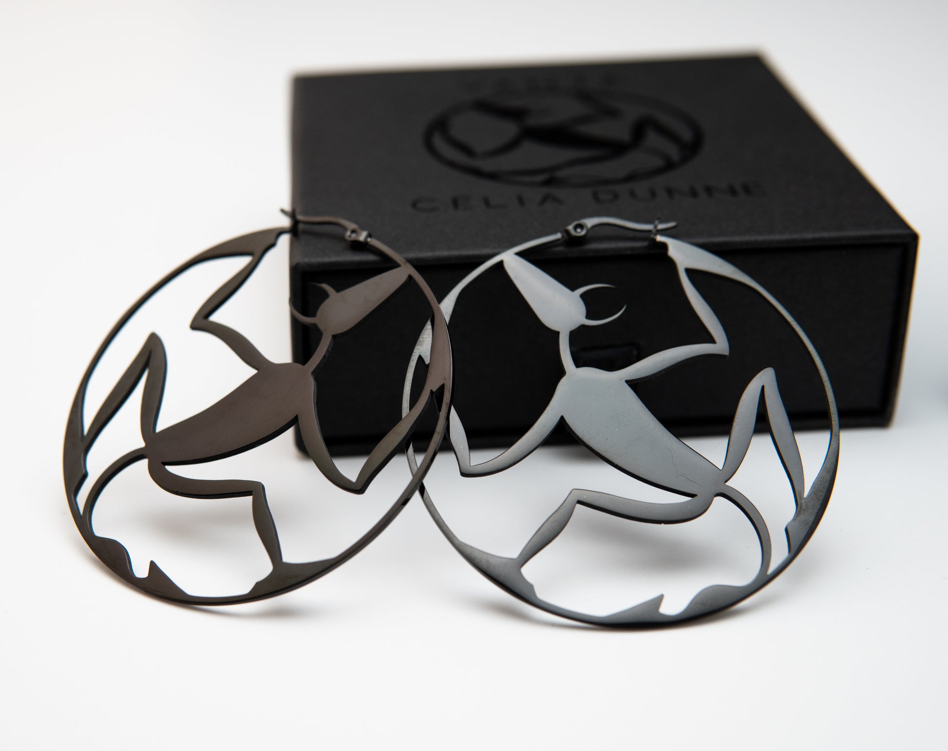 A collaboration with Celia Dunne, these black electroplated hoops feature delicate detailing and an effortlessly bold silhouette. Inspired by Celia's Iconic Devil motifs.