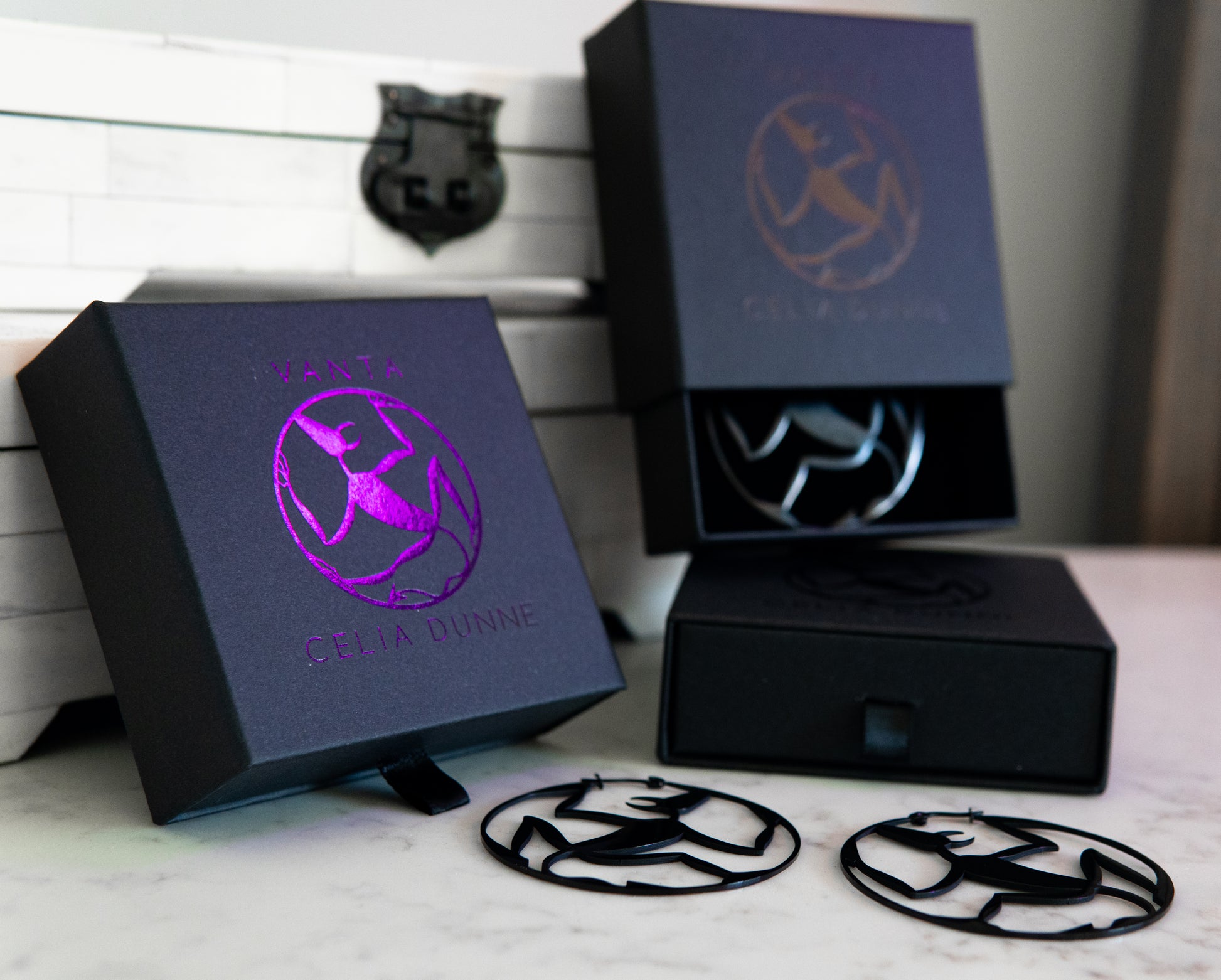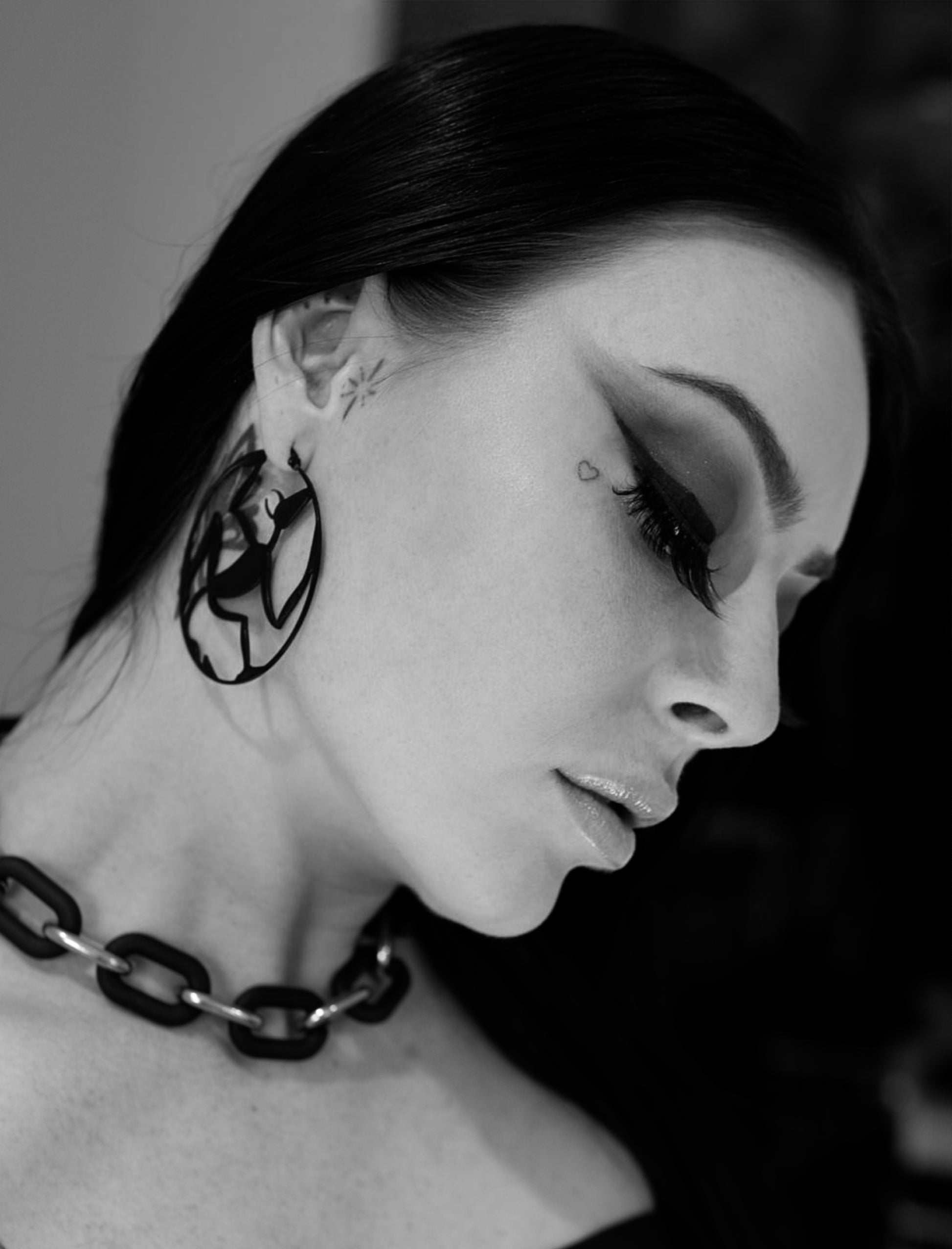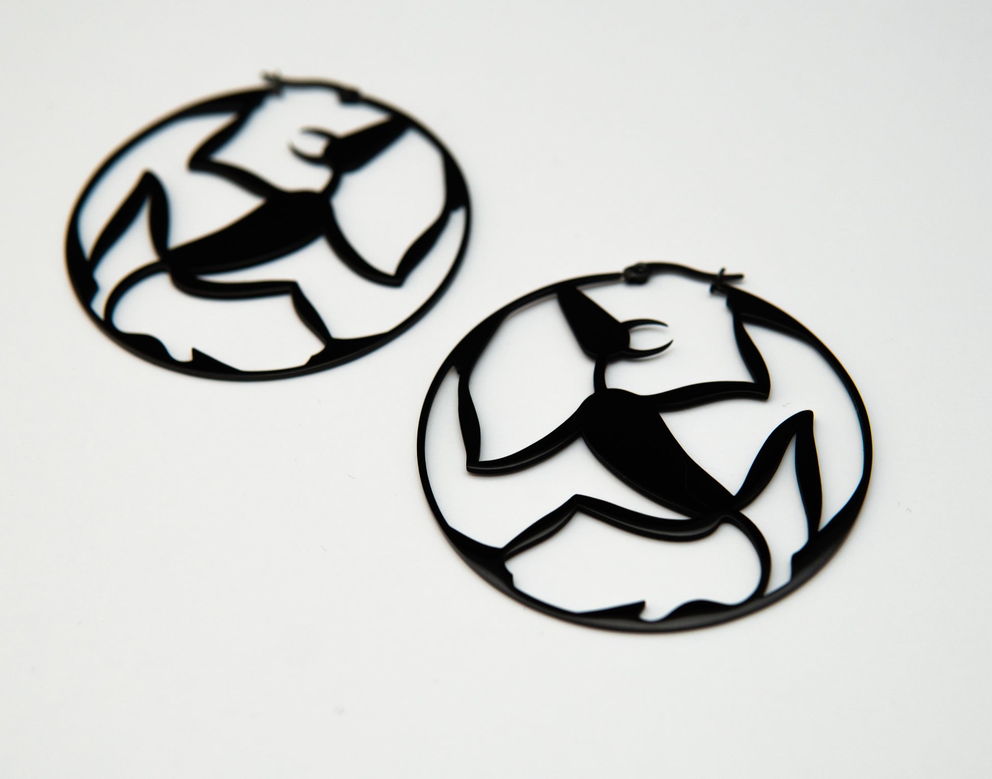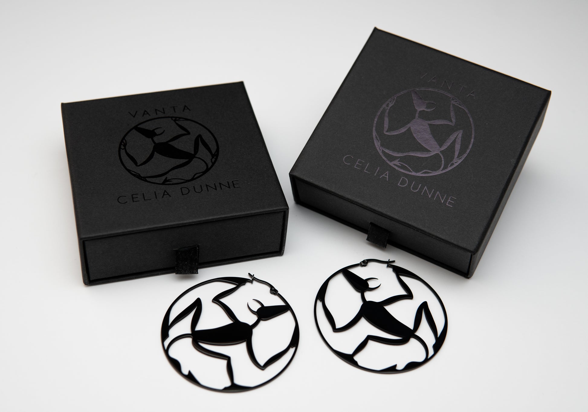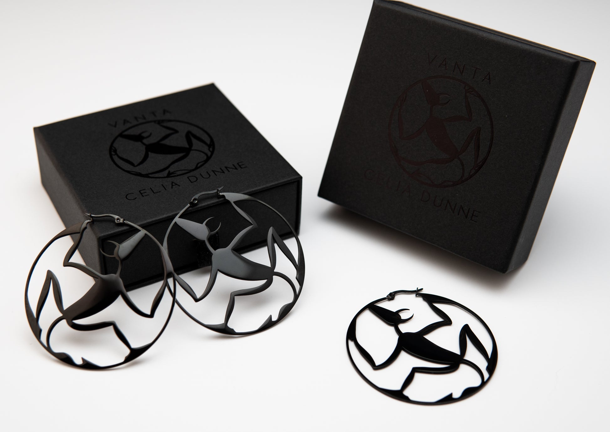 A collaboration with Celia Dunne, these black electroplated hoops feature delicate detailing and an effortlessly bold silhouette. Inspired by Celia's Iconic Devil motifs.
